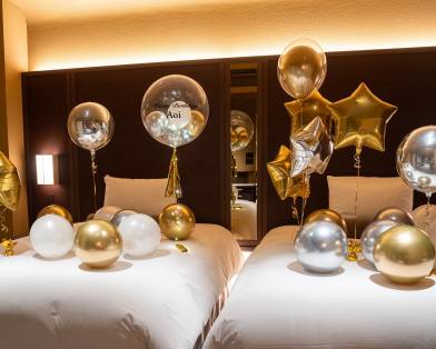 「ふふ 河口湖」ではバルーンサービスを承っております。 大切な方のお誕生日やお二人の特別な記念日など、特別な日にお部屋を彩るバルーンのご用意はいかがでしょうか。 ご予約はこちらより承っております。
